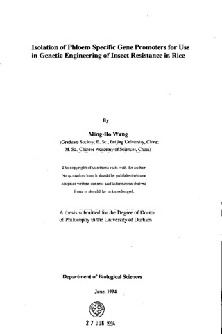 Towards the aim of producing transgenic rice with enhanced resistance to one of its phloem sap-sucking insect pests, the brown planthopper (BPH), two potential phloem-specific promoters, of the rice sucrose synthase-1 (RSsl) and the cucurbit phloem protein PP2 genes, were isolated and investigated. Using a PGR fragment of the maize sucrose synthase-1 (Shi) gene, genomic clones containing the RSsl and RSs2 (rice sucrose synthase-2) genes were isolated from a genomic library of rice (Oryza sativa L. Japonica) and characterised. A full- length RSsl gene from one of the genomic clones was sequenced, including 1756 bp of 5'-flanking sequence and 710 bp of 3'-flanking sequence. The gene had an identical intron-exon structure (16 exons and 15 introns) to the maize Shi gene. The RSsl 5'- flankmg region contained a number of promoter-like sequences, including putative exacting elements homologous to those found in several endosperm-specific, anaerobiosis-inducible, or phloem-specific promoters. The RSsl promoter region, including 1.9 kb 5'-flanking sequence, the first intron, the first exon, and the translational start codon, was fused with coding sequences for β-glucuronidase (GUS) and snowdrop (Galanthus navalis) lectin (GNA). Tobacco plants were transformed with these chimaeric genes in order to determine the expression pattern directed by the RSsl promoter. Histochemical and immunochemical assays demonstrated that the expression of both GUS and GNA was restricted to phloem cells in various tissues (i.e. stem, root, leaf, petiole) and in different transformants. In addition, GNA was detected by immunological assay in the honeydew excreted by peach potato aphids (Myzus persicae), also a phloem sap- sucking insect, feeding on RSsl-GNA transgenic tobacco plants. This provided direct evidence that GNA was not only expressed in the phloem tissue, but was also present in the phloem sap of transgenic tobacco plants. Since GNA has been shown to have antimetabolic effect against BPH, the RSsl-GNA construct is being used to transform rice plants by collaborating groups elsewhere. In order to isolate the phloem protein PP2 gene promoter, the PP2 polypeptide from 3 months old Cucurbita pepo plants was partially sequenced after in situ cleavage with cyanogen bromide vapour, giving 75 residues of sequence on two cyanogen . bromide fragments. Using an oligonucleotide probe based on this amino acid sequence, cDNA clones encoding PP2 were isolated from a C. pepo cDNA library constructed from mRNA of 3-5 days old seedling hypocotyls. A cDNA clone was used as probe to screen a C. pepo genomic library, and several genomic clones were isolated. Restriction mapping showed that these clones contained different genes, consistent with results from Southern blots of C. pepo genomic DNA probed with PP2 cDNA, in which multiple bands were detected in all restriction endonuclease digests. One of the clones was partially sequenced, and was shown to contain a gene encoding PP2. A 1.2 kb 5'-flanking region of this clone was fused with a GUS reporter gene, and this construct was used to transform tobacco. Initial histochemical analysis showed that this chimaeric gene was not expressed in the putative transgenic plants examined. Possible reasons for this failure are discussed.