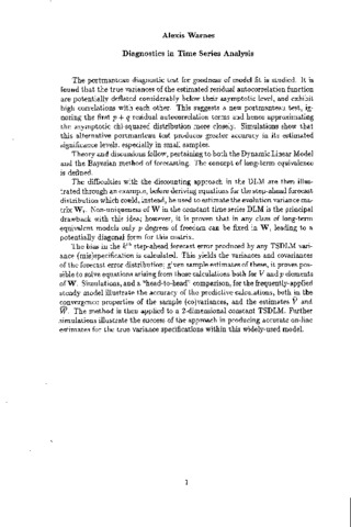 The portmanteau diagnostic test for goodness of model fit is studied. It is found that the true variances of the estimated residual autocorrelation function are potentially deflated considerably below their asymptotic level, and exhibit high correlations with each other. This suggests a new portmanteau test, ignoring the first p + q residual autocorrelation terms and hence approximating the asymptotic chi-squared distribution more closely. Simulations show that this alternative portmanteau test produces greater accuracy in its estimated significance levels, especially in small samples. Theory and discussions follow, pertaining to both the Dynamic Linear Model and the Bayesian method of forecasting. The concept of long-term equivalence is defined. The difficulties with the discounting approach in the DLM are then illustrated through an example, before deriving equations for the step-ahead forecast distribution which could, instead, be used to estimate the evolution variance matrix W(_t). Non-uniqueness of W in the constant time series DLM is the principal drawback with this idea; however, it is proven that in any class of long-term equivalent models only p degrees of freedom can be fixed in W, leading to a potentially diagonal form for this matrix. The bias in the k(^th) step-ahead forecast error produced by any TSDLM variance (mis)specification is calculated. This yields the variances and covariances of the forecast error distribution; given sample estimates of these, it proves possible to solve equations arising from these calculations both for V and p elements of W. Simulations, and a "head-to-head" comparison, for the frequently-applied steady model illustrate the accuracy of the predictive calculations, both in the convergence properties of the sample (co)variances, and the estimates Ṽ and Ŵ. The method is then applied to a 2-dimensional constant TSDLM. Further simulations illustrate the success of the approach in producing accurate on-line estimates for the true variance specifications within this widely-used model.