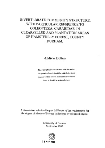 Invertebrate community structure, with particular reference to Coleoptera: Carabidae, in Clearfelled and plantation areas of Hamsterley forest, county Durham