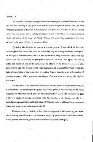 An exponent of the much maligned form cancionero poetry, Nicolás Núńez was one of the few poets writing in this genre who received some recognition. Some years ago Keith Whinnom produced and edition of Continuación of Cárcel de Amor, Nicolás Núńez's poetic works however remain almost entirely unstudied. The aim of this thesis is to produce a critical study and edition of the poetry of Nicolás Núńez, who epitomises a generation of writers devoted to the game of poetry or the game of love. Exploring this definition of love as a 'courtly pastime', I have sifted the formulaic critical appraisal of courtly love, with the aim of clarifying and revising this critical stand point. In the light of the Herculean effort of Keith Whinnom to bring a breath of fresh air to this rather state field of criticism, the first part of my work, based in 15(^th)C Spain, will seek to define the theme of love in the cancioneros in relation to the theory of love as a play phenomenon, and will proceed to the close examination of a seminal text which reveals the ludic characteristics of this genre. Here I elucidate features essential to an understanding of cancionero poetry, which represents a confluence of three strands: the courtly, the religious and sexual. Unfortunately I have been unable to discover any new details relatives to the identity of Nicolás Núńez. My edition upon his poetic opus which proposes new additions to the canon suggested by Alan Deyermond, precedes my critical study of a poet who represents the final work in a chain of learning originating with the Cancionero de Baena, and who is a magnificent exponent of this highly individual 15(^th)C poetic form. In addition, I have considered issues such as the dating and authorship of LBl. Fundamental to my thesis is the first of the four appendices which make up part three. The remaining appendices are a compilation of previously published texts and critical studies, which provide information germane to the understanding of certain chapters.