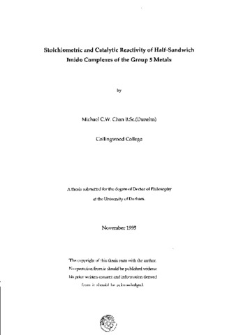 This thesis describes investigations into the chemistry of half-sandwich imido complexes of the Group 5 metals, with particular emphasis on the development of complexes which can be applied to catalytic processes. Chapter 1 provides an introduction to the imido ligand and highlights aspects of the reactivity of half-sandwich transition metal imido and related complexes. The isolobal analogy between Group 4 bent me'tallocene. Group 5 half-sandwich imido and Group 6 bis(imido) metal fragments is outlined. In Chapter 2, reactions of CpV(NR)Cl(_2) (R=2,6-(^i)Pr(_2)C(_6)H(_3), 2,6-Me(_2)C(_6)H(_3)) with alkylating agents are described, yielding a number of highly unusual products. The novel structures of [CpV(N-2,6-(^i)Pr(_2)C(_6)H(_3))(|i-Me)2]2(l^-Mg) and [CpV(fx-N-2,6-iPr2C6H3)]2(|i-Me), featuring bridging methyl and imido substituents, have been determined. The former also possesses the first crystallograghically characterised V-Mg bond and multiple agostic interactions. The aim of Chapter 3 was to evaluate the steric and electronic influence of the imido substituent in half-sandwich imido complexes of niobium. For the [CpNb(N-2-(^t)BuC(_6)H(_4))] system, the successful isolation of a number of previously unstable species has been reported. The orientations of the diphenylacetylene and the ethylene ligands in CpNb(N-2-(^t)BuC(_6)H(_4))(PhC=CPh)(PMe(_3)) and CpNb(N-2,6-Cl(_2)C(_6)H(_3))(C(_2)H(_4))(PMe(_3)) respectively have been established through crystal structures and lend support to the isolobal relationship between the [Cp(_2)Zr] and [CpNb(NR)] fragments. In Chapter 4, the tantalum dialkyl complexes Cp*Ta(N(^t)Bu)(CH(_2)R)(_2) R=Ph, CMe(_2)Ph, CMe(_3)] are described and the molecular structure of Cp*Ta(NtBu)(CH(_2)CMe(_3))') reveals multiple agostic interactions. Reactions of Cp*Ta(N(^t)Bu)(CH(_2)R)(_2) with excess C(_6)F(_5)OH yield a number of crystallographically characterised pentafluorophenoxide and oxo-bridged products, namely [Cp*Ta(CH(_2)Ph)(0C(_6)F(_5))(µ-O)](_2), Cp*Ta(OC(_6)F(_5))(_4) and [Cp*Ta(OC(_6)F(_5))(_2)(µ-0)](_2). Chapter 5 discusses attempts to develop and explore the oxidative coupling chemistry at the half-sandwich tantalum imido fragment. Hence, a number of new tantalacyclopentane complexes and related species have been prepared, including Cp*Ta(N-2,6-(^i)Pr(_2)C(_6)H(_3))(σ-l,4-(2-Et)C(_4)H(_7)) and Cp*Ta(N- 2,6-(^i)Pr(_2)C(_6)H(_3))[a-l,6-C(0)(3-Et)C(_4)H(_7)C(0)].Chapter 6 contains the experimental details for Chapter 2-5.