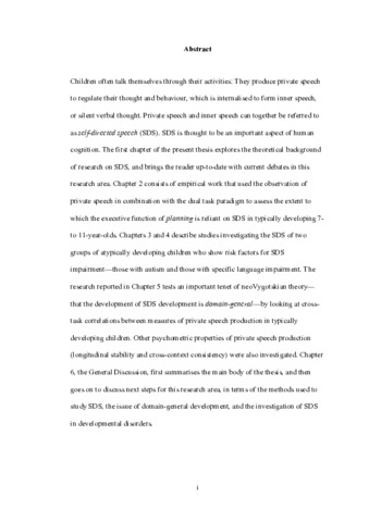 Children often talk themselves through their activities: They produce private speech to regulate their thought and behaviour, which is internalised to form inner speech, or silent verbal thought. Private speech and inner speech can together be referred to as self-directed speech (SDS). SDS is thought to be an important aspect of human cognition. The first chapter of the present thesis explores the theoretical background of research on SDS, and brings the reader up-to-date with current debates in this research area. Chapter 2 consists of empirical work that used the observation of private speech in combination with the dual task paradigm to assess the extent to which the executive function of planning is reliant on SDS in typically developing 7- to 11-year-olds. Chapters 3 and 4 describe studies investigating the SDS of two groups of atypically developing children who show risk factors for SDS impairment—those with autism and those with specific language impairment. The research reported in Chapter 5 tests an important tenet of neoVygotskian theory—that the development of SDS development is domain-general—by looking at cross-task correlations between measures of private speech production in typically developing children. Other psychometric properties of private speech production (longitudinal stability and cross-context consistency) were also investigated. Chapter 6, the General Discussion, first summarises the main body of the thesis, and then goes on to discuss next steps for this research area, in terms of the methods used to study SDS, the issue of domain-general development, and the investigation of SDS in developmental disorders.