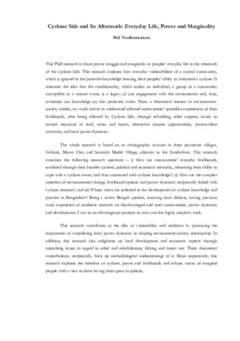 This PhD research is about power struggle and marginality in peoples’ everyday life in the aftermath of the cyclone Sidr. This research explores how everyday vulnerabilities of a coastal community, which is ignored in the powerful knowledge framing, limit peoples’ ability to withstand a cyclone. It reiterates the idea that the conditionality, which makes an individual, a group or a community susceptible to a natural event, is a legacy of our engagement with the environment and, thus, scrutinise our knowledge on that particular event. From a theoretical interest in environment-society studies, my work strives to understand affected communities’ quotidian experiences of their livelihoods, after being affected by Cyclone Sidr, through rebuilding, relief support, access to natural resources in land, water and forest, alternative income opportunities, patron-client networks, and local power dynamics. The whole research is based on an ethnographic account in three proximate villages, Gabtola, Mazer Char and Sonatola Model Village, adjacent to the Sundarbans. This research examines the following research questions – i) How are communities’ everyday livelihoods, mediated through their broader societal, political and economic networks, informing their ability to cope with a cyclone event, and thus connected with cyclone knowledge?; ii) How are the complex interface of environmental change, livelihood options and power dynamics reciprocally linked with cyclone rhetoric?; and iii) Whose views are reflected in the development of cyclone knowledge and practice in Bangladesh? Being a native Bengali speaker, knowing local dialects, having previous work experience of academic research on disadvantaged and rural communities, power dynamics and development, I was in an advantageous position to carry out this highly sensitive work. This research contributes to the idea of vulnerability and resilience by portraying the importance of considering local power dynamics in shaping environment-society relationship. In addition, this research also enlightens on local development and economic aspects through unpacking issues in regard to relief and rehabilitation, fishing and forest use. These theoretical contributions, reciprocally, back up methodological underpinnings of it. More importantly, this research explores the interface of cyclone, power and livelihoods and echoes voices of marginal people with a view to them having their space in policies.