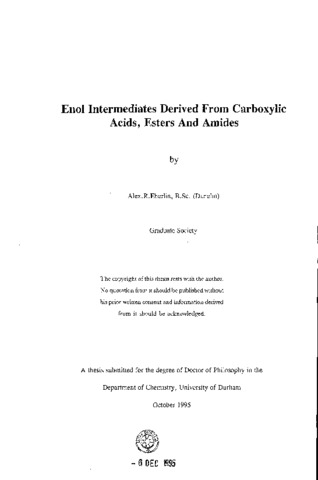 A kinetic investigation into the enolisation mechanism and enol contents of simple carboxylic acids, esters and amides has been undertaken. Measurement of the enolisation rate constants for malonic acid, ethylhydrogenmalonate and 2- carboxyacetamide were obtained. The halogenation reactions were carried out under conditions where the rate determining step was the enolisation and the reactions were zero order in halogen. The measurements were carried out using u.v./visible spectrophotometry. Results obtained for malonic acid and ethylhydrogenmalonate support the idea of an intramolecular acid catalysed mechanism involving a hydrogen bonded six membered transition state. The enolisation mechanisms were investigated in a number of buffer solutions and were found to be catalysed by general bases. Catalytic coefficients for the following bases were calculated, HO(_2)CCH(_2)CO(_2)-, EtO(_2)CCH(_2)CO(_2)-,ClCH(_2)CO(_2)-, and H(_2)O. Deuterium exchange reactions were monitored using (^1)H N.M.R. and enolisation rate constants for cyano-containing esters and amides were calculated. The results show that the enolisation of amides occurs via an acid catalysed process whereas the enolisation of carboxylic acids and esters proceeds by an intramolecular acid catalysed or a general base catalysed mechanism. Enol contents for simple carboxylic acid derivatives were determined from their reactions with halogens under conditions where the reaction of the halogen with the enol is rate limiting and the reaction is found to be first order in the halogen. It was demonstrated that chlorine, bromine and iodine react with carboxylic ester enols at or very close to the diffusion controlled limit (ca 5x10(^9) 1 mol(^-1) sec(^-1)). The enol contents measured were found to be greater than expected, with the enol content of malonic acid very similar to that of acetone. An estimate of the acidity of carboxylic acid enols has shown them to be strong acids with pK(_a) values in the region 2-5.