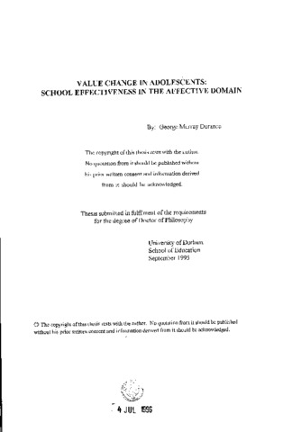 Factors contributing to school effectiveness in the affective domain have been largely ignored in recent research in spite of a transnational concern about value disorientation. This thesis explores the influence a secondary school has on adolescent value formation. Current theories on "effective schooling" and "valuing" provide a framework for the research. Following an introduction to the issue of values in schools, the thesis reviews the literature on "values", "effective schools", and "school climate" before proceeding to a description of a two site, longitudinal study. The creation of a value change-effective schools (VCES) model enabled local school issues to be analysed in conjunction with an overarching theory and principles which are relevant to a broad educational community. The four complementary surveys of parents, students and staff included a wide range of items which address frequently voiced methodological criticisms of the "effective schools” approach. Subsequent chapters summarise and discuss the findings of the surveys and place them in the context of current research. The thesis demonstrates that a school has a significant, unique role to play in adolescent value formation. Value change did not emerge as a cause and effect phenomenon, but as a complex interaction of change agents operating within the terms of the value change-effective schools model. Programmes and strategies, which have meaning at the local level, can be developed for the affective domain based on insights provided by the model. The factors associated with effectiveness were determined and defined primarily by the local schools. They crossed over domains from the cognitive to the affective, coalescing to form an effective learning environment.