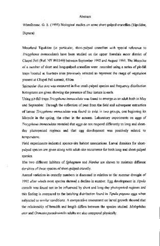Moorland Tipulidae (in particular, short-palped craneflies with special reference to Tricyphona immaculata) have been studied on the upper Teesdale moor district of Chapel Fell (Ref NY 863349) between September 1992 and August 1993. The lifecycles of a number of short and long-palped craneflies were recorded using a series of pit-fall traps located at fourteen sites previously selected to represent the range of vegetation present at Chapel Fell summit, 630m.Spiracular disc size was measured in five small-palped species and frequency distribution histograms are given showing the presence of four instars in each. Using pit-fall traps Tricyphona immaculata was found to emerge as an adult both in May and September. Through the collection of peat from the field and subsequent extraction of larvae Tricyphona immaculata was found to exist in two groups, one beginning its lifecycle in the spring, the other in the autumn. Laboratory experiments on eggs of Tricyphona immaculata revealed that eggs do not respond differently to long and short- day photoperiod regimes and that egg development was positively related to temperature. Field experiments indicated species-site habitat associations. Larval densities for short- palped species are given along with adult-site occurrence for both long and short-palped species. The two different habitats of Sphagnum and Nardus are shown to maintain different densities of three species of short-palped cranefly. Annual variation in cranefly numbers is discussed in relation to the summer drought of 1992 after which most species showed a decline in number. Egg development in Tipula czezeki was found not to be influenced by short and long-day photoperiod regimes and this finding is compared to the hatching distribution found in Tipula pagana eggs when subjected to similar conditions. A comparative assessment on larval growth showed that the relationship of breadth and length differs between the species studied. Molophilus after and Ormosia pseudosimilis adults are also compared physically.