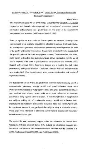This thesis investigated the use of 'minimal' (gender/number information, linguistic conjunction and thematic role occupancy) and 'non-minimal' information (spatial information and description type - proper name vs. role name i.e. the waiter) in the comprehension of pronouns, (McKoon and Ratcliff, 1992).Fourteen experiments were conducted. Seven experiments measured clause-by-clause reading times; seven measured frequency of reference in sentence continuation tasks. Six reading time experiments used materials pronominally unambiguous on the basis of the gender and number information. Experiments one to twelve also manipulated the spatial location of the characters (together or apart). Experiments five, six, seven, eight, eleven and twelve also manipulated noun phrase conjunction (by the use of 'and'), proposed to be a cue to plural pronoun use (Hielscher and Musseler, 1990; Sanford and Lockhart 1991). Experiment thirteen was a reading time task using pronominally ambiguous sentences. Characters' thematic roles and description type were manipulated. Experiment fourteen was a sentence continuation task version of experiment thirteen. For experiments one to twelve, the predictions were that subjects making use of a constructionist processing strategy would read plural references faster when characters were described as being together rather titan apart. In continuation tasks, it was predicted that subjects would make more plural references to characters described as being together rather than apart. In experiment thirteen it was predicted that subjects making use of a minimalist strategy would read references faster depending on the character's thematic role occupancy rather than on description type. In experiment fourteen it was predicted that subjects using a minimalist strategy would make more references to characters on the basis of thematic role occupancy rather than description type. The results did not consistently support either the minimalist or constructionist hypotheses. Subjects appeared instead to be making use of different strategies as a function of task demands. This interpretation is in line with work by Garnham et al (1992), McKoon and Ratcliff (1992), and Oakhill et al (1989).