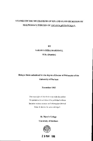 Inhibitors of known transport processes, in conjunction with ion substitution were used in biochemical, physiological and microelectrode studies to investigate the mechanisms underlying ion and fluid secretion across the Malpighian tubules of Locusta migratoria. Immunocytochemical localization and cell fractionation methods used in conjunction with biochemical analyses demonstrate the presence of Na(^+)/K(^+)-ATPase activity on the basal cell membranes and HCO(_3)(^-)-stimulated and V-type ATPase activities on apical cell membranes. The biochemical properties of the HCO(_3)(^-)-stimulated and V-type ATPase activities are compared and the results discussed. Specific inhibitors of Na(^+)/K(^+)-ATPase and V-type ATPases inhibited fluid secretion whilst cAMP was found to stimulate fluid secretion. The continued secretion of K(^+) when tubules were bathed in K(^+)-free saline was attributed to the presence of mineral concretions shown in ultrastructural studies to be distributed throughout the cytoplasm. The effects of ouabain, NEM and cAMP on the cationic composition of the "urine" were studied. In control saline, ouabain and NEM increased the level of Na(^+) in the "urine" whereas cAMP caused an increase in the amount of K(^+) secreted. In Rb(^+)-saline, ouabain caused "urine" levels of Na(^+) to increase and levels of Rb(^+) to fall whereas cAMP and NEM had no effect on the cationic composition of the "urine". Ion substitution experiments used in conjunction with intracellular microelectrodes suggest the basal cell membrane contains an inward rectifying K(^+) channel. Blocking the basal inward rectifier with Rb(+) drove the potential of this membrane towards the emf of the apical membrane potential. In the presence of Rb(^+), bafilomycin A(_1), a specific V-type ATPase inhibitor, reduced this potential suggesting the apical membrane potential is produced by a V-type ATPase. The results are discussed and a hypothetical model is proposed to account for the mechanisms of ion and fluid movement across apical and basal cell surfaces.