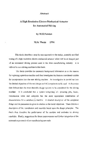 This thesis describes a step by step approach to the design, assembly and final testing of a high resolution electro-mechanical actuator which will be an integral part of an automated skiving process used in the shoe manufacturing industry. It is referred to as a skiving machine in this thesis. The thesis provides the necessary background information as to the reasons for replacing a previous machine and then investigates the features considered suitable for incorporation into the new skiving machine. An investigation is carried" out into the desired objectives of the new design and the components to be used. A discussion then follows into the most desirable design systems to be considered for the skiving machine. It is concluded that a system comprising, of- actuating pins, levers, transmission wires and,, solenoids has the most ' appropriate combination of I, characteristics for a satisfactory machine, a' detailed description of the completed design and its parameters is given in relation to the initial objectives. There follows a description of the manufacture' and assembly based upon the design principles. The thesis then describes the performance of the machine and evaluates its skiving capability. Finally, suggestions for future improvements and further integration of the automation process in shoe manufacturing are made.