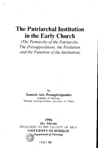The Patriarchal institution in the early church: (The Pentarchy of the Patriarchs. The presuppositions, the evolution and the function of the institution).