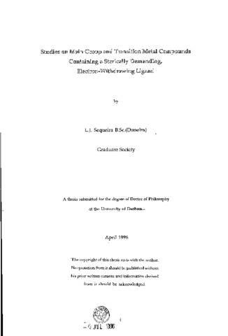 The studies described herein relate to the co-ordination chemistry of l,3,5-tris(trifluoromethyl)benzene, Ar(^F)H. The unique combination of steric bulk and a highly electron-withdrawing nature found in the a- bound Ar(^F) ligand has already been exploited to stabilise a variety of unusual main group compounds including the surprisingly air- and moisture-stable diphosphene Ar(^F)P=Par(^F). Other examples are discussed in the introductory chapter, as is the increasingly active area of diphosphene research. Chapter 2 describes the synthesis and structural characterisation of six early σ-Ar(^F) transition metal complexes, Mo(N(^t)Bu)(_2)(Ar(^F))2, Cr(NAd)(_2)(Ar(^F))(_2), [Mo(NAr)(_2)(Ar(^F))Cl-LiCl(dme)](_2), V(Ar(^F))(_2)Cl(thf), V(Ar(^F))(_3)-O -Li(thf)(_3) and Cr(Ar(^F))(_2)(PMe(_3))(_2). The first five of these compounds exhibit the rare phenomenon of weak metal-fluorine interactions, which is discussed in terms of several structural factors such as tilting of the aryl ring towards the direction of the M-F interaction The co-ordination chemistry of the diphosphenes Ar(^F)p=PArF, Ar*P=PAr* and Ar*P=PArF (Ar* = 2,4,6-(^t)BuC6H3) is reported in chapter 3. Ar(^F)p=Par(^F) is shown to displace olefins from a bis(imido)molybdenum centre to generate complexes such as Mo(NR)(_2)(PMe)(_3)(Ti2-ArFp=PArF) (R = tBu, 2,6-iPr2C6H3). The crystal structure of Mo(NtBu)2(PMe)3(Ti2- ArFp=PArF) has been elucidated. Related investigations have focused on the co-ordination mode of the diphosphenes Ar*P=PAr* and Ar*P=PArFwith [Pt(PEt3)Cl2]2/ and a variety of Til-complexes has been spectroscopically observed. The development of phosphorus based analogue of the industrially important olefin metathesis reaction is detailed in chapter 4. The reaction of ArPCl2, [Ar = Ar(^F), Ar* and 2,6-(CF3)2-C6H3 (Ar(^f1)] with the halide abstractor W(PMe3)6 leads to the generation of ArP=PAr via a postulated [W]=PAr phosphinidene intermediate. The unsymmetrical diphosphene ArFp=PAr* has been synthesised analogously from a mixture of ArFPCl2 and Ar*PCl2 with W(PMe3)6- When Ar is small (2,4,6-iPr3C6H2, 2,4,6- Me3C6H2), ArPCl2 reacts with W(PMe3)6 to give three-membered tricyclophosphanes, [ArP](_3) π-bound complexes of the Ar(^F)H ligand have been synthesised via metal vapour synthesis experiments, carried out in collaboration with Prof. F.G.N. Cloke at Sussex University. Chapter 5 describes the preparation of the bis-arene complexes M(T|6-ArFH)2 (M=Cr, V, Nb) and Ru(Ti6-ArFH)(Ti4-ArFH).Full experimental details and characterising data for chapters 2-5 are collected in chapter 6.