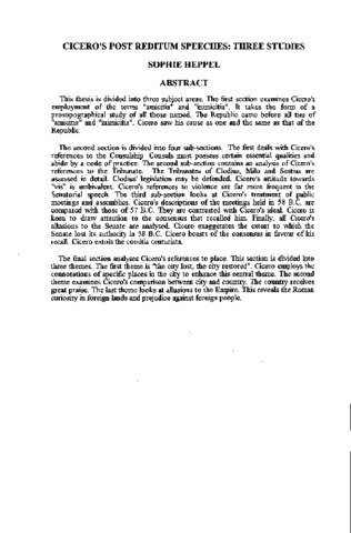 This thesis is divided into three subject areas. The first section examines Cicero’s employment of the terms "amicitia" and "inimicitia". It takes the form of a prosopographical study of all those named. The Republic came before all ties of "amicitia" and "inimicitia". Cicero saw his cause as one and the same as that of the Republic. The second section is divided into four sub-sections. The first deals with Cicero’s references to the Consulship. Consuls must possess certain essential qualities and abide by a code of practice. The second sub-section contains an analysis of Cicero’s references to the Tribunate. The Tribunates of Clodius, Milo and Sestius are assessed in detail Cloduis' legislation may be defended. Cicero's attitude towards "vis" is ambivalent. Cicero's references to violence are fax more Sequent in the Senatorial speech. The third sub-section looks at Cicero's treatment of public meetings and assemblies. Cicero's descriptions of the meetings held in 58 B.C. are compared with those of 57 B.C. They are contrasted with Cicero's ideal Cicero is keen to draw attention to the consensus that recalled him. Finally, all Cicero’s allusions to the Senate are analysed. Cicero exaggerates the extent to which the Senate lost its authority in 58 B.C. Cicero boasts of the consensus in favour of his recall Cicero extols the comitia centuriata. The final section analyses Cicero's references to place. This section is divided into three themes. The first theme is "the city lost, the city restored". Cicero employs the connotations of specific places in the city to enhance this central theme. The second theme examines Cicero's comparison between city and country. The country receives great praise. The last theme looks at allusions to the Empire. This reveals the Roman curiosity in foreign lands and prejudice against foreign people.