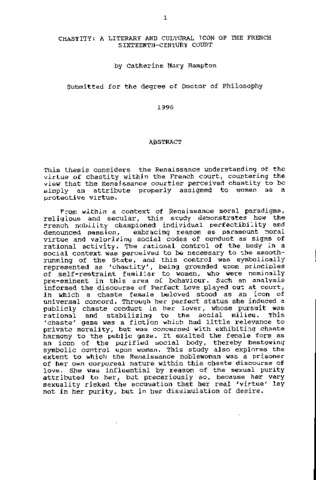 This thesis considers the Renaissance understanding of the virtue of chastity within the French court, countering the view that the Renaissance courtier perceived chastity to be simply an attribute properly assigned to women as a protective virtue. From within a context of Renaissance moral paradigms, religious and secular, this study demonstrates how the French nobility championed individual perfectibility and denounced passion, embracing reason as paramount moral virtue and valorizing social codes of conduct as signs of rational activity. The rational control of the body in a social context was perceived to be necessary to the smooth- running of the State, and this control was symbolically represented as 'chastity', being grounded upon principles of self-restraint familiar to women, who were nominally pre-eminent in this area of behaviour. Such an analysis informed the discourse of Perfect Love played out at court, in which a chaste female beloved stood as an icon of universal concord. Through her perfect status she induced a publicly chaste conduct in her lover, whose pursuit was rational and stabilizing to the social milieu. This 'chaste' game was a fiction which had little relevance to private morality, but was concerned with exhibiting chaste harmony to the public gaze. It exalted the female form as an icon of the purified social body, thereby bestowing symbolic control upon woman. This study also explores the extent to which the Renaissance noblewoman was a prisoner of her own corporeal nature within this chaste discourse of love. She was influential by reason of the sexual purity attributed to her, but precariously so, because her very sexuality risked the accusation that her real 'virtue' lay not in her purity, but in her dissimulation of desire.