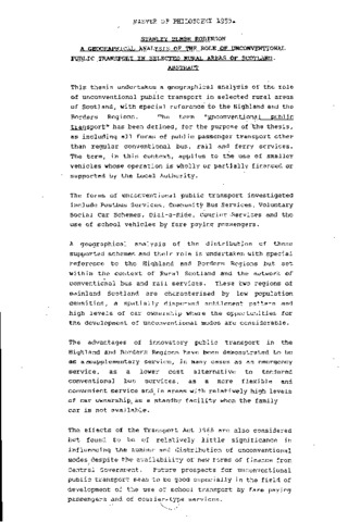This thesis undertakes a geographical analysis of the role of unconventional public transport in selected rural areas of Scotland, with special reference to the Highland and the Borders Regions. The terra "unconventional public transport" has been defined, for the purpose of the thesis, as including all forms of public passenger transport other than regular conventional bus, rail and ferry services. The terra, in this context, applies to the use of smaller vehicles whose operation is wholly or partially financed or supported by the Local Authority. The forms of unconventional public transport investigated include Postbus Services, Community Bus Services, Voluntary Social Car Schemes, Dial-a-Ride, Courier Services and the use of school vehicles by fare paying passengers. A geographical analysis of the distribution of these supported schemes and their role is undertaken with special reference to the Highland and Borders Regions but set within the context of Rural Scotland and the network of conventional bus and rail services. These two regions of mainland Scotland are characterised by low population densities, a spatially dispersed settlement pattern and high levels of car ownership where the opportunities for the development of unconventional modes are considerable. The advantages of innovatory public transport in the Highland and Borders Regions have been demonstrated to be as a supplementary service, in many cases as an emergency service, as a lower cost alternative to tendered conventional bus services, as a more flexible and convenient service and in areas with relatively high levels of car ownership, as a standby facility when the family car is not available. The effects of the Transport Act 1985 are also considered but found to be of relatively little significance in influencing the number and distribution of unconventional modes despite the availability of new forms of finance from Central Government. Future prospects for unconventional public transport seem to be good especially in the field of development of the use of school transport by fare paying passengers and of courier-type services.