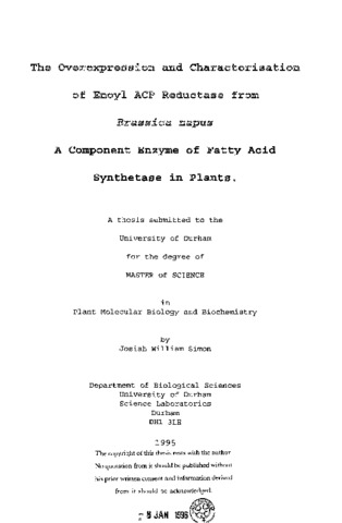 The overexpression and characterisation of Enoyl ACP Reductase from Brassica. napus: a component enzyme of fatty acid synthetase in plants