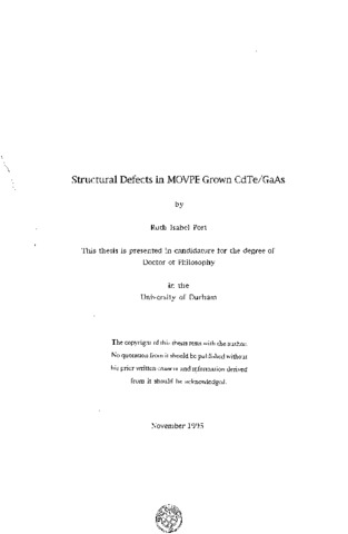 This work presents a study of the character and distribution of structural defects in (00l)CdTe buffer layers grown on GaAs substrates by metal organic vapour phase epitaxy (MOVPE). These are of importance as hybrid substrates for the growth of Cd(_x)Hg(1-x)Te (CMT), a prominent infrared detector material. The 14.5% mismatch between CdTe and GaAs leads to a high-density of dislocations at the CdTe/GaAs interface, and threading through the layer. The presence of linear and planar defects is detrimental to the performance of CMT devices and it is desirable to reduce the density of dislocations to below l0(^5)cm(^-2). Results of high resolution X-ray diffraction (HRXRD) studies on a series of MOVPE grown CdTe/GaAs epilayers of different thickness and on a single thick layer which was repeatedly etched and remeasured are reported. Threading dislocation density was estimated from HRXRD full width at half maximum (FWHM) using a relationship proposed by Gay, Hirsch and Kelly and was found to decrease rapidly in the initial stages of layer growth. An optimum buffer layer thickness of 8µm is proposed for the subsequent growth of CMT. Rocking curves were recorded from a single thick CdTe/GaAs epilayer for wavelengths in the range 0.69-1.95A at the Daresbury SRS, and this data is extrapolated to infinite absorption to obtain an estimate of the rocking curve width representative of the surface of a thick layer. A number of models which attempt to describe the reduction in threading dislocation density with increasing thickness are reviewed and a new model based on the coalescence of like dislocations is developed. The models are compared to published data for layers with misfit in the range 0.23-14.6%. The models previously developed by Tachikawa and Yamaguchi and by Durose and Tatsuoka are shown to be the more appropriate for describing the dislocation density distribution in highly mismatched layers. Results of the transmission electron microscopy of CdTe/GaAs epilayers, both in plan view and cross-section, showing the character of dislocations threading through thick CdTe buffer layers are presented. Many dipoles composed of 30º type dislocations with Burgers vectors parallel to the interface were observed and found to adopt an orientation whereby the component dislocations had no effect on misfit strain. In cross-section, 30º type dislocations with Burgers vectors inclined to the interface were found to be numerous, 60º and screw type threading dislocations were also observed, but the cross-section projection axis made analysis of these types difficult. The screw and edge components of 30º , 60º and screw type threading dislocations are compared and it is found that the Burgers vector component causing layer tilt is of magnitude (a(_o)/2) for each type. Annealing of CdTe/GaAs epilayers under di-methyl cadmium flow was found to have no deleterious effect on layer morphology but did not result in a narrower X-ray rocking curve. Based upon HRXRD FWHM, 8µm thick CdTe buffer layers grown by MOVPE are estimated to have a dislocation density of about 3xl0(^8)cm(^-2). Even after many of the threading dislocations have been bent over at the CdTe/CMT interface, their density in MOVPE grown CMT/CdTe/GaAs is still greatly in excess of the l0(^5)cm(^-2) desired. The issues discussed and conclusions drawn in this thesis represent a thorough study of the continuing progress towards high quality MOVPE growth of CMT.