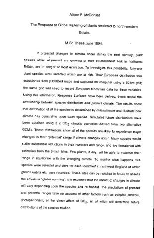 If projected changes in climate occur during the next century, plant species which at present are growing at their southernmost limit in northwest Britain, are in danger of local extinction. To Investigate this possibility, forty-one plant species were selected which are at risk. Their European distribution was established from published maps and captured on computer using a 50 km grid; the same grid was used to record European bioclimate data for three variables. Using this information, Response Surfaces have been derived; these model the relationship between species distribution and present climate. The results show that distribution of all the species is determined by macroclimate and illustrate how climate has constraints upon each species. Simulated future distributions have been obtained using 2 x CO(_2) climatic scenarios derived from two alternative GCM's. These distributions show all of the species are likely to experience major changes in their "potential" range if climate changes occur. Many species would suffer substantial reductions in their numbers and range, and are threatened with extinction from the British Isles. Few plants, if any, will be able to maintain their range in equilibrium with the changing climate. To monitor what happens, five species were selected and sites for each identified in northwest England at which growth habits etc. were recorded. These sites can be revisited in future to assess the effects of "global warming". It is expected that the impact of changes in climate will vary depending upon the species and its habitat. The simulations of present and potential ranges take no account of other factors such as edaphic controls, photoperiodism, or the direct affect of CO(_2), all of which will determine future distributions of the species studied.