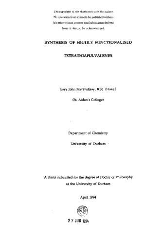 A range of functionalised symmetrical and unsymmetrical tetrathiafulvalene (TTF) derivatives containing substituted 4,5-(propylene- 1,3-dithio) units fused to the TTF framework has been prepared. In particular, TTF derivatives bearing hydroxy or ketone functionality have been obtained. Cyclic voltammetric studies establish that the new TTF derivatives are efficient π-electron donors; they undergo two reversible, single-electron redox waves. A series of new bis- and tris-tetrathiafulvalene derivatives has been prepared. The TTF-thiolate anion has been used as a key intermediate and shown to be a particularly versatile reagent for this purpose. 4-(Benzoylthio) tetrathiafulvalene has been prepared and serves as a convenient shelf-stable precursor of the TTF-thiolate anion. A novel pentakis-tetrathiafulvalene macromolecule has been efficiently synthesised. The solution electrochemistry of the new multi-TTF derivatives has been studied by cyclic voltammetry, which reveals that the TTF moieties do not interact to any significant extent. Methodology has been developed for the preparation of highly functionalised analogues of TTF containing the 9,10-bis(l,3-dithiol-2- ylidene)-9,l 0-dihydroanthracene unit. These are versatile electron donor systems and have been used in the construction of novel redox assemblies.