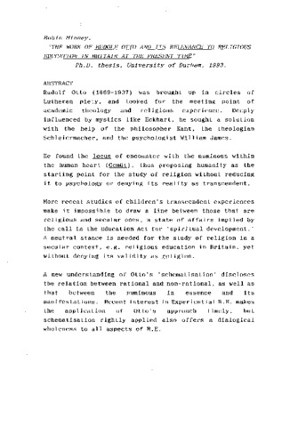 Rudolf Otto (1869-1937) was brought up in circles of Lutheran piety, and looked for the meeting point of academic theology and religious experience. Deeply influenced by mystics like Eckhart, he sought a solution with the help of the philosopher Kant, the theologian Schleiermacher, and the psychologist William James. He found the locus of encounter with the numinous within the human heart (Gemut) . thus proposing humanity as the starting point for the study of religion without reducing it to psychology or denying its reality as transcendent. More recent studies of children's transcendent experiences make it impossible to draw a line between those that are religious and secular ones, a state of affairs implied by the call in the Education Act for 'spiritual development.' A neutral stance is needed for the study of religion in a secular context, e.g. religious education in Britain, yet without denying its validity as religion. A new understanding of Otto's 'schematisation' discloses the relation between rational and non-rational, as well as that between the numinous in essence and its manifestations. Recent interest in Experiential R.E. makes the application of Otto's approach timely, but schematisation rightly applied also offers a dialogical wholeness to all aspects of R.E.