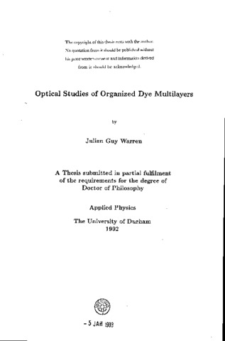 The optical studies of organized dye multilayers constructed by the Langmuir- Blodgett technique are described. A number of different organic dye materials are examined; and some warrant special attention. They are S120 a cyanine, the squaraines and perylene. It is shown that these dyes form particularly well ordered films with unique optical properties. S120 forms J-aggregates, Sql and Sq3 both squaraines form hypsochromicaly shifted complexes (possibly H-aggregates) and Sq2 another squaraine exhibits band splitting (possibly Davydov). Fluorescence studies of perylene:tricosanoic acid films show that monomer and dimer species exist at room temperature, whilst at low temperature a third emitter is observed (excimer).Structural studies of perylene:tricosanoic acid films reveal a high degree of order. From the isotherms and polarized absorption spectra it is seen that the molecules are on their edges, tilted with respect to the substrate. RHEED measurements confirm the high degree of structural order. The dependence of surface plasmon resonance on the overlayers is demonstrated. The silver thickness and history are shown to be important in subsequent surface plasmon resonance measurements. An overlayer containing a dye with a sharp intense absorption band can interact with the surface plasmons to give anomalous dispersion (backbending). Only single backbending is observed for 8120 and Sql, indicating anisotropic films. Good agreement is found between 8120 backbending and data reported in the literature.