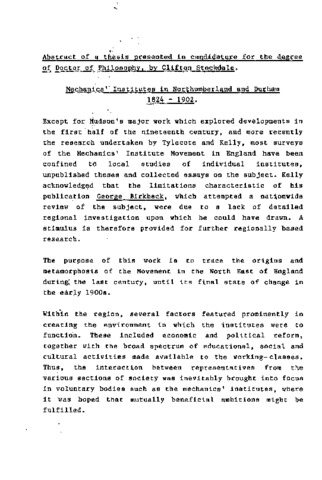 Except for Hudson's major work which explored developments in the first half of the nineteenth century, and more recently the research undertaken by Tylecote and Kelly, most surveys of the Mechanics' Institute Movement in England have been confined t6 local studies of individual institutes, unpublished theses and collected essays on the subject. Kelly acknowledged that the limitations characteristic of his publication George. Birkbeck. which attempted a nationwide review of the subject, were due to a lack of detailed regional investigation upon which he could have drawn. A stimulus is therefore provided for further regionally based research. The purpose of this work is to trace the origins and metamorphosis of the Movement in the North East of England during; the last century, until its final state of change in the early 1900s.Within the region, several factors featured prominently in creating the environment in which the institutes were to function. These included economic and political reform, together with the broad spectrum of educational, social and cultural activities made available to the working-classes. Thus, the interaction between representatives from the various sections of society was inevitably brought into focus in voluntary bodies such as the mechanics' institutes, where it was hoped that mutually beneficial ambitions might be fulfilled. The Mechanics' Institute Movement in the North East reflected experiences which were typical of many other regions, yet much was exceptional. To illustrate this point, certain issues have been subjected to detailed analysis - in particular the identity of promoters, their motives, and how they brought their schemes to fruition. The effect of the powerful and often conflicting demands for the various services which together constituted both adult education and recreation has been assessed against a background determined by the promoters of institutes and by increasing Government legislation which provided for the introduction of public libraries and technical instruction. Consequently, the survival of the institutes was secured within a climate of progressive external and internal pressures. In the past, the full significance of the Movement's contribution to working-class educational, social and cultural development has lacked the appreciation it deserves. This regional analysis has shown that after existing for almost one hundred years its legacy remains encapsulated within our national system of public libraries, technical colleges, social centres, and not least in our heritage of mechanics' institute buildings. The task of providing insights into the complexity of the Movement's role in the North East has not been achieved without confronting difficulties similar to those experienced by Kelly and others. If any questions, therefore, remain unanswered, they do so because of the elusiveness of source material. At best, much was of a scattered, fragmentary and sometimes contradictory nature. Despite diligently pursued enquiry at repositories both locally and in other parts of the country, it has had to be accepted that the location of many relevant items is unknown.