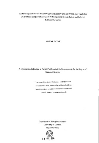 An investigation into the recent vegetation history of Great Wood, near Eggleston Co. Durham using fine resolution pollen analysis of Mor humus and relevant historical evidence.
