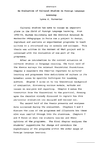 Cultural studies has come to occupy an important place in the field of foreign language learning. From 1990-93, Durham University and the Institut National de Recherche Pedagogique in Paris ran a project to design, implement and evaluate an experimental programme to teach culture in a structured way in schools and colleges. This thesis was written in the context of that project and is concerned with the evaluation of one part of the programme. After an introduction to the current situation of cultural studies in language learning, the first half of the thesis surveys the relevant theoretical foundations. Chapter 2 considers the theories important to cultural learning and progresses from definitions of culture in its broadest sense to specific techniques for teaching culture. Chapter 3 moves on to the theoretical background of evaluation, discussing various models, methods and issues in analysis and reporting. Chapter 4 makes the transition from the theoretical to the practical, drawing upon the theories already discussed to explain how this particular evaluation was designed and carried out. The second half of the thesis presents and analyses data collected during the evaluation. Chapters 5 and 6 discuss the aims of the programme and illustrate how these aims were carried through into the classroom. Chapters 7 and 8 focus on what the students learned and their opinions of the programme. The final chapter analyses the students' suggestions for change and considers the significance of the programme within the wider scope of foreign language learning.