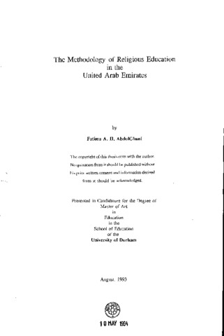 In this thesis Islamic teaching methodology in the UAE has been examined in relation to Islamic ideology, the Qur'an and Muhammad's (pbuh) teaching methods, and in accordance with the social aims in the UAE. The aim of the investigation and the methodology used are outlined in Chapter I. Chapters II and III consider the nature and process of Islamic education as derived from the Islamic world view. They also try to demonstrate that the content of religious education is derived from the Holy Qur'an; the accepted model of the religious education teacher is derived from the personality and character of the Prophet Muhammad (pbuh); and that the methods of religious education are derived from, and legitimated by, his practice. Chapter IV attempts to show how the scope and purpose of religious education is derived from the concept of community (Ummah) and the Islamic way of life (Shariah).These crucial features of Islam have implications for education and methodology. The Islamic subject teacher is expected to teach for a community larger than the classroom and for a way of life larger than the intellect or schooling. Detailed discussion of the teacher’s role is given in Chapter IV, while Islamic teaching methodology in the UAE is examined in Chapter V. Chapter VI discusses the relation between what is seen in the Emirates at the period of study and Islamic ideology and the methodologies of the Qur'an and Muhammad (pbuh). It examines methodologies in accordance with social aims in the UAE. The same chapter explores the conclusions and recommendations harvested from this work.