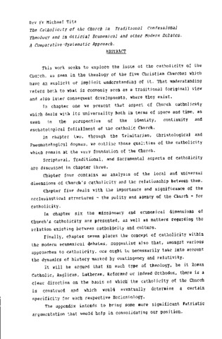 This work seeks to explore the issue of the catholicity of the Church, as seen in the theology of the five Christian Churches which have an explicit or implicit understanding of it. That understanding refers both to what is commonly seen as a traditional (original) view and also later consequent developments, where they exist. In chapter one we present that aspect of Church catholicity which deals with its universality both in terms of space and time, as seen in the perspective of the identity, continuity and eschatological fulfillment of the catholic Church. In chapter two, through the Trinitarian, Christoiogical and Pneumatological dogmas, we outline those qualities of the catholicity which remain at the very foundation of the Church. Scriptural, Traditional, and Sacramental aspects of catholicity are discussed in chapter three. Chapter four contains an analysis of the local and universal dimensions of Church's catholicity and the relationship between them. Chapter five deals with the importance and significance of the ecclesiastical structures - the polity and agency of the Church - for catholicity. In chapter six the missionary and ecumenical dimensions of Church’s catholicity are presented, as well as matters regarding the relation existing between catholicity and culture. Finally, chapter seven places the concept of catholicity within the modern ecumenical debates, suggesting also that, amongst various approaches to catholicity, one ought to necessarily take into account the dynamics of history marked by contingency and relativity. It will be argued that in each type of theology, be it Roman Catholic, Anglican. Lutheran, Reformed or indeed Orthodox, there is a clear direction on the basis of which the catholicity of the Church is construed and which would eventually determine a certain specificity for each respective Ecclesiology. The appendix intends to bring some more significant Patristic argumentation that would help in consolidating our position.