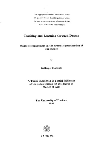 This study looks at the nature of the children's engagement in the dramatic activities. It identifies seven stages of engagement in the dramatic presentation of experience. These stages have a conceptual as well as an empirical basis. In order to provide a conceptual basis for the stages the study examines the processes by which the children manage to make meaning in everyday contexts. It relates the ways in which the everyday contexts are created and presented to the ways in which the dramatic contexts are created and presented and shows that they differ only in the way they are treated by people. It also examines the nature of the engagement in the dramatic activity and draws upon the connection between drama and theatre art, and drama and play. It shows that engagement in the drama has its basis in the children's play and in the art form of drama (in the application of dramatic form). It also shows that the learning opportunities that the dramatic engagement opens up for the children are related to the teacher's role in the drama and also to the children's play. The empirical basis for the stages is defined through the analysis of the teachers' and the children's engagement in drama situations and through dramatic activities in which the teacher and the children routinely engage when they do drama. Finally, the study looks at the implications of the stages and the way these can be used to help the teachers develop their knowledge and confidence about drama, plan their work with the children and provide a framework for the evaluation of dramatic engagements.
