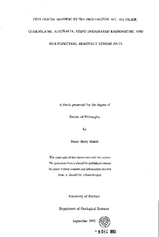 Landsat Thematic Mapper, NSOOl Aircraft Thematic Mapper, Geoscan Mk. II. Multispectral Scanner and Airborne Gamma Radiometric data have been used to address a variety of geological problems in the Mary Kathleen area, 60 km east of Mt. Isa, NW Queensland. This area forms part of the Cloncurry Complex, a structurally complicated mass of diverse igneous and metamorphic rocks in the Precambrian Mt. Isa Inlier for which many stratigraphic problems remain to be solved. The Landsat Thematic Mapper data have been the most extensively used in this study. They are the least problematic data type and provide new geological information at scales up to 1:50 000. The NSOOl Aircraft Thematic Mapper data have similar spectral but superior spatial resolution in comparison with the satellite data. They suffer from increased geometric and noise-related problems, but the increase in spatial resolution has allowed the solution of problems, at scales up to 1:10 000, which could not be comprehensively addressed with the satellite data. The higher spectral resolution Geoscan Mk. II Multispectral Scanner aircraft data used in the latter part of the study can be used to remotely identify surface mineralogy. The logarithmic residual technique has proved the most successful approach to enhancing the radiance data sets. When applied to the lower spectral resolution data the technique achieves good discrimination of most lithologies, produces an albedo image useful for structural mapping and yields more information than can be extracted using conventional techniques. When applied to the higher spectral resolution data the technique allows remote mineral identification. Many of the geological problems in the area have been wholly or partially solved using suitably processed radiance data. The Airborne Gamma Radiometric data have the lowest spatial resolution. Only discrimination has been possible with this data set. These data contain no terrain information and are therefore difficult to use in the field. Integration of the gamma radiometric data with satellite data has been successful in overcoming this problem. The gamma radiometric data have allowed the separation of some lithologies which cannot be separated using the radiance data sets but have contrasting radiometric counts.
