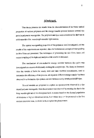 This thesis presents the results from the characterisation of the linear optical properties of various polymers and the energy transfer process between several dye pairs in polymeric waveguides. The polymers and dyes were considered for their use in solid state thin film wavelength tuneable light sources. The optical waveguiding properties of the polymers were investigated, and the results of the experiments are reported. Also the fundamental concepts of wave guiding in thin films are presented. The techniques of processing the thin films, input and output coupling of the light and analysis of the results is discussed. The mechanism of non-radiative energy transfer between dye pairs was investigated as a means of efficiently exciting the acceptor dye. The theory is discussed. Also the results of both the steady state and time resolved experiments, used to determine the efficiency of the process, are reported. Efficient energy transfer has been observed in a rhodamine dye system and also between newly developed BASF dyes. Several models are proposed to explain an up conversion observed in a dye doped polymer waveguide. Here fluorescence was observed by exciting the dye in the long wavelength tail of the absorption band. A model based on the thermal population of electrons to higher vibrational levels, from where they can be promoted to the first excited electronic state, is shown to best explain the phenomenon.