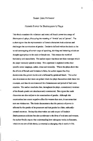This thesis examines the existence and extent of female power in a range of Shakespeare’s plays, discussing the meaning of 'female' and of 'power'. The author argues that the representation of female characters both endorses and challenges the construction of gender. Gender is defined within the thesis as the sexed-stereotyping of certain ways of speaking, thinking and behaving which are thought appropriate to the male or female sex. This creates the world of femininity and masculinity. The author argues that these are false concepts which the plays variously uphold or deny. This argument is explored within four specific areas: language, action, dress and sexuality. Where the plays show that the elision of female and feminine is false, the author argues that they demonstrate that power could exist unaffected by gendered ideals. The author also demonstrates that there are points where the plays themselves elide these two concepts, and thus do not transcend the circumstances and period of their own creation. The author concludes that, throughout the plays, contradictory versions of the female gender are simultaneously constructed. She argues that male characters are also subject to the construction of gender. Although this construction has a more negative effect for women than men, it can mean that men are victims too. The thesis demonstrates that the potency of power is affected by the gender of its possessor and that gender is a false, culturally- created construct. Seeing this observation not only as part of feminist Shakespearean criticism but also as relevant to the lives of real men and women, the author finally argues that understanding how misogyny works in literature, which is one aim of this thesis, is essential to changing why it works in life.
