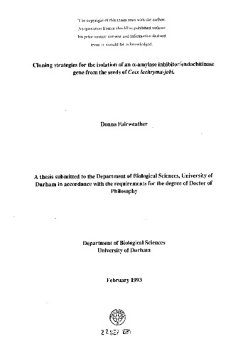 The aim of this work was to isolate the gene encoding a bifunctional a-amylase inhibitor/endochitinase protein from the seeds of Coix lachryma-jobi, a tropical cereal. Prior to this study, it had been demonstrated that this bifunctional protein had anti-insect and possibly anti-fungal properties. Consequently the gene could potentially be used to confer insect and fungal resistance in transgenic plants. A multifunctional approach was undertaken to isolate the a-amylase inhibitor/endochitinase cDNA and genomic sequences, involving three main strategies. Immunoscreening a Coix cDNA expression library with antibodies raised against a wheat germ endochitinase protein resulted in the isolation of three immunopositive clones. These cDNA's, were sequenced and one characterised as a seed storage protein, named a-coixin. Despite extensive searches of the appropriate databases, the function of the other two are as yet unknown. Another strategy was the production of polyclonal antibodies, raised against a glutathione S- transferase-a-amylase inhibitor fusion peptide. It was envisaged that these antibodies could be used to isolate the gene of interest following immunoscreening of the Coix cDNA expression library. Polyclonal antibodies were successfully elicited against the glutathione S- transferase moiety, but could not detect the a-amylase inhibitor protein when assayed. Using the polymerase chain reaction, amplification of the a-amylase inhibitor coding sequence was attempted from Coix genomic DNA, cDNA and a Coix seed cDNA library. PGR product were successfully amplified from genomic DNA and the cDNA library. Further characterisation of these product revealed that they were a result of non specific amplifications. Further work required to isolate the a-amylase inhibitor gene is discussed.