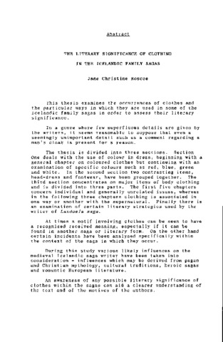 This thesis examines the occurrences of clothes and the particular ways in which they are used in some of the Icelandic family sagas in order to assess their literary significance. In a genre where few superfluous details are given by the writers, it seems reasonable to suppose that even a seemingly unimportant detail such as a comment regarding a man's cloak is present for a reason. The thesis is divided into three sections. Section One deals with the use of colour in dress, beginning with a general chapter on coloured clothes but continuing with an examination of specific colours such as red, blue, green and white. In the second section two contrasting items, head-dress and footwear, have been grouped together. The third section concentrates on major items of body clothing and is divided into three parts. The first five chapters concern individual and generally unrelated issues, whereas in the following three chapters clothing is associated in one way or another with the supernatural. Finally there is an examination of certain literary strategies used by the writer of Laxdoela saga. At times a motif involving clothes can be seen to have a recognised received meaning, especially if it can be found in another saga or literary form. On the other hand certain incidents have been analysed specifically within the context of the saga in which they occur. During this study various likely influences on the medieval Icelandic saga writer have been taken into consideration - influences which may be derived from pagan and Christian mythology, cultural traditions, heroic sagas and romantic European literature. An awareness of any possible literary significance of clothes within the sagas can aid a clearer understanding of the text and of the motives of the authors.