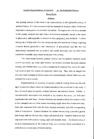 The primary concern of this thesis is the representation, in the eighteenth century, of mothers' bodies. It is also concerned with the treatment of domestic duties which were supposed a consequence of a woman's very nature. Throughout the first seven decades of the century, medical men and virtuosi demonstrated particular interest in the nature of physicality, and especially in women's bodies, pregnancy, and childbirth. 1 will be testing out a widely-held view that dissection and new anatomical findings regarding women's bodies produced a new idealisation of motherhood, and that this was immediately translated into lay-medical and related discourse, and was thus firmly established in middle-class culture by the end of the century. The relationship between primary medical and lay-medical literature raises several questions: my work asks whether lay-medical literature mirrored medical writing, and whether there was a direct translation of material from one to the other. Lay-medical texts for women are especially interesting. They offer an insight into precisely what examples of female nature and correspondingly 'natural' behaviour were intended for women readers. Representations of maternity in specific forms of writing which rely heavily upon women for subject matter are further extended in the second half of this study. 1 have focussed upon two genres, conduct literature and narrative fiction. Neither is conventionally associated with medical or lay-medical discourse, yet both have significant links with these. Conduct literature and narrative fiction have much to offer in this attempt to recover what women were being taught about their bodies and roles; both were concerned with what the body displays externally, and with corresponding ideas of 'naturalness'. Conduct literature for women was enjoying a period of growth and change, and has obvious, direct links with medical texts. Narrative fiction also had important links with medical writing, and 1 will describe these. The dissemination of medical representations of the maternal body was a process which contributed to a contradictory cultural sense of female identity.