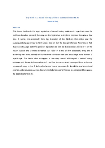 This thesis deals with the legal regulation of sexual history evidence in rape trials over the last four decades, primarily focusing on the legislative restrictions imposed throughout that time. It works chronologically from the formation of the Heilbron Committee and the subsequent change in law in 1976 under Section 2 of the Sexual Offences Amendment Act. It goes on to judge both this piece of legislation as well as its successor; Section 41 of the Youth Justice and Criminal Evidence Act 1999 in terms of how successful they are in achieving their aims; namely to increase the conviction rate and encourage more women to report rape. The thesis aims to suggest a new way forward with regard to sexual history evidence and its use in the courts which has thus far encountered many problems and come up against many critics. It looks at scholars’ recent proposals for legislative and procedural change and discusses each on its own merits before using them as a springboard to suggest the best idea for reform.