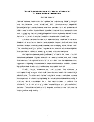 Surface tethered bottle-brush co-polymers are prepared by ATRP grafting of the macroinitiator brush backbone onto plasmachemical deposited poly(vinylbenzyl chloride) initiator nanofilms, followed by ATRP growth of the side chains (bristles). Lateral force scanning probe microscopy demonstrates that poly(glycidyl methacrylate)-graft-poly(sodium 4-styrenesulfonate) bottle-brush decorated surfaces give rise to an enhancement in lubrication. Patterned polymer brushes are fabricated using molecular scratchcard lithography, where a functional top nanolayer (acting as a resist) is selectively removed using a scanning probe tip to expose underlying ATRP initiator sites. The lateral spreading of grafted polymer brush patterns across the adjacent functional resist surface is reversibly actuated by solvent exposure. Macroporous poly(vinylbenzyl chloride) scaffolds are used for ATRP initiation to generate polymer brushes and thereby actuate pore size. These functionalised macroporous scaffolds are fabricated by a decoupled two-step approach comprising plasmachemical deposition of the host material followed by spontaneous emulsion formation using amphiphilic species. Finally, charge nanopatterning onto polymer film surfaces is accomplished by using an SPM probe tip to create localised corona discharge electrification. The efficacy of surface charging is shown to correlate strongly to the polymer substrate hydrophilicity. Localised plasma generation using a scanning probe microscope tip is then demonstrated to actuate the movement of ATRP surface grafted polyelectrolyte and polyzwitterionic brushes. The raising or retraction of polymer brushes can be controlled by varying the SPM tip polarity.