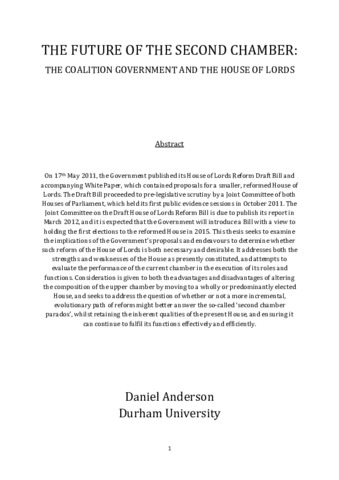 On 17th May 2011, the Government published its House of Lords Reform Draft Bill and accompanying White Paper, which contained proposals for a smaller, reformed House of Lords. The Draft Bill proceeded to pre-legislative scrutiny by a Joint Committee of both Houses of Parliament, which held its first public evidence sessions in October 2011. The Joint Committee on the Draft House of Lords Reform Bill is due to publish its report in March 2012, and it is expected that the Government will introduce a Bill with a view to holding the first elections to the reformed House in 2015. This thesis seeks to examine the implications of the Government’s proposals and endeavours to determine whether such reform of the House of Lords is both necessary and desirable. It addresses both the strengths and weaknesses of the House as presently constituted, and attempts to evaluate the performance of the current chamber in the execution of its roles and functions. Consideration is given to both the advantages and disadvantages of altering the composition of the upper chamber by moving to a wholly or predominantly elected House, and seeks to address the question of whether or not a more incremental, evolutionary path of reform might better answer the so-called ‘second chamber paradox’, whilst retaining the inherent qualities of the present House, and ensuring it can continue to fulfil its functions effectively and efficiently.