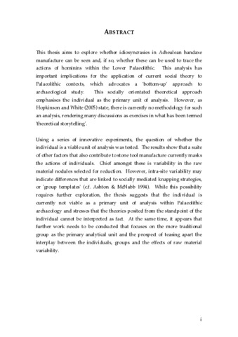 This thesis aims to explore whether idiosyncrasies in Acheulean handaxe manufacture can be seen and, if so, whether these can be used to trace the actions of hominins within the Lower Palaeolithic. This analysis has important implications for the application of current social theory to Palaeolithic contexts, which advocates a 'bottom-up' approach to archaeological study. This socially orientated theoretical approach emphasises the individual as the primary unit of analysis. However, as Hopkinson and White (2005) state, there is currently no methodology for such an analysis, rendering many discussions as exercises in what has been termed 'theoretical storytelling'. Using a series of innovative experiments, the question of whether the individual is a viable unit of analysis was tested. The results show that a suite of other factors that also contribute to stone tool manufacture currently masks the actions of individuals. Chief amongst these is variability in the raw material nodules selected for reduction. However, intra-site variability may indicate differences that are linked to socially mediated knapping strategies, or 'group templates' (c.f. Ashton & McNabb 1994). While this possibility requires further exploration, the thesis suggests that the individual is currently not viable as a primary unit of analysis within Palaeolithic archaeology and stresses that the theories posited from the standpoint of the individual cannot be interpreted as fact. At the same time, it appears that further work needs to be conducted that focuses on the more traditional group as the primary analytical unit and the prospect of teasing apart the interplay between the individuals, groups and the effects of raw material variability .
