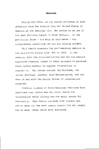 During the 1860s, no one nation attracted as much attention from the British than the United States of America as the American Civil War proved to be one of the most divisive topics in Great Britain. In one particular forum - the British Parliament – the divisiveness concerning the war was clearly evident. This thesis examines the parliamentary debates on the neutrality policy from 1861 to 1863. In the debates, both the interventionists and the neutralists exploited numerous issues in their attempts to persuade their fellow members to support intervention or neutrality. The issues include the blockade, the cotton shortage, slavery, self-determination, and the fear of war with the United States if intervention occurred. Previous studies of Anglo-American relations have concluded that cotton was the major reason for intervention while slavery was the major reason for neutrality. This thesis contends that slavery and cotton were not the most common reasons for but simply two of many issues which were discussed.