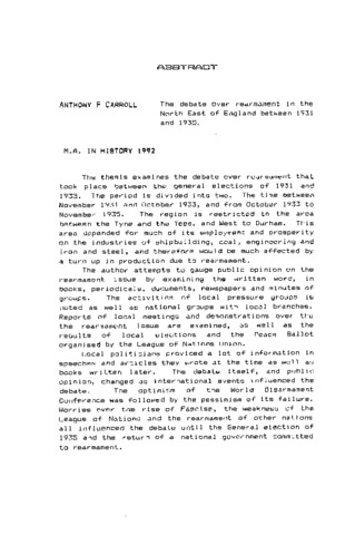 The thesis examines the debate over rearmament that took place between the general elections of 1931 and 1935. The period is divided into two. The time between November 1931 and October 1933, and from October 1933 to November 1935. The region is restricted to the area between the Tyne and the Tees, and West to Durham. This area depended for much of its employment and prosperity on the industries of shipbuilding, coal, engineering and iron and steel, and therefore would be much affected by a turn up in production due to rearmament. The author attempts to gauge public opinion on the rearmament issue by examining the written word, in books, periodicals, documents, newspapers and minutes of groups. The activities of local pressure groups is noted as well as national groups with local branches. Reports of local meetings and demonstrations over the rearmament issue are examined, as well as the results of local elections and the Peace Ballot organised by the League of Nations Union. Local politicians provided a lot of information in speeches and articles they wrote at the time as well as books written later. The debate itself, and public opinion, changed as international events influenced the debate. The optimism of the World Disarmament Conference was followed by the pessimism of its failure. Worries over the rise of Fascism, the weakness of the League of Nations and the rearmament of other nations all influenced the debate until the General election of 1935 and the return of a national government committed to rearmament.