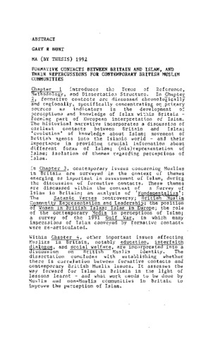 Chapter 1 introduces the Terms of Reference, Methodology, and Dissertation Structure. In Chapter 2, formative contacts are discussed chronologically and regionally, specifically concentrating on primary sources as indicators in the development of perceptions and knowledge of Islam within Britain - forming part of European interpretation of Islam. The historical narrative incorporates a discussion of earliest contacts between Britain and Islam; 'evolution' of knowledge about Islam; movement of British agents into the Islamic world - and their importance in providing crucial information about different forms of Islam; (mis)representation of Islam; isolation of themes regarding perceptions of Islam. In Chapter 3, contemporary issues concerning Muslims in Britain are surveyed in the context of themes emerging as important in assessment of Islam, during the discussion of formative contacts. These themes are discussed within the context of a Survey of Islam in Britain; an analysis of 'Fundamentalism’; The Satanic Verses controversy; British Muslim Community Representation and Leadership; the position of Women in British Islam; Islam in Europe; the role of the contemporary Media in perceptions of Islam; a survey of the 1991 Gulf War, in which many impressions of Islam conveyed by formative contacts were re-articulated. Within Chapter 4, other important issues affecting Muslims in Britain, notably education, interfaith dialogue, and social welfare, are incorporated into a discussion on British Muslim identity. The dissertation concludes with establishing whether there is correlation between formative contacts and contemporary British Muslim issues. It assesses the way forward for Islam in Britain in the light of lessons learnt - and what work needs to be done by Muslim and non-Muslim communities in Britain to improve the perception of Islam.