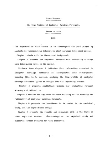 The objective of this thesis is to investigate the part played by analysts in incorporating information about earnings into stock-prices. Chapter 1 deals with the theoretical background. Chapter 2 presents the empirical evidence that accounting earnings have Information value to the market. Evidence from chapter 3 indicates that information contained in analysts' earnings forecasts Is incorporated into stock-prices. Assuming this to be correct, studying the time-profile of analysts’ earnings forecasts gives an Insight into the impounding process. Chapter 4 presents statistical methods for evaluating forecast accuracy and rationality. Chapter 5 reviews the empirical evidence relating to the accuracy and rationality of analysts' earnings forecasts. Chapters 6 presents the hypotheses to be tested in the empirical study, and the experimental design, Chapter 7 presents the results and discusses them in the light of other empirical studies. Shortcomings of the empirical study and suggested further research are then presented.
