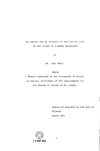 The reported incidences of shallow failures on the slopes of highway earthworks have increased in recent years. This Thesis includes a study of the extent of this problem, the likely factors contributing to failure, and presents the results of empirical design and the analysis of the likely mechanism of failure. A survey was conducted, covering a total length of 570km of selected lengths of motorway in England and Wales, which included the principal geologies encountered on the British motorway system, in particular, areas where over-consolidated clays predominate. From the survey, the basic factors that have contributed to shallow failures on the side slopes of embankments and cuttings can be deduced, and attempts are made to quantify any long-term problems. The results show a high incidence of failure associated with the major influences of geology, age of earthworks and geometry of slope, with many more failures occurring on embankments than on cuttings. The slope angles recommended are empirically derived and can be used both in the design of new earthwork side slopes and to identify slopes at risk of failure in existing earthworks. An estimate is made of the extent of failures in the future which suggests that three times as many slopes are likely to fail than have failed so far. To study the mechanisms of failure and the behaviour of over- consolidated clays at extremely low effective stresses, an analytical method is developed which includes a detailed study of non-linear failure envelopes and the fitting of the most representative curve to peak strength data. Also a new rigorous slope stability analysis method is developed which incorporates this type of failure envelope. Back-analyses are conducted for several embankment slopes from which samples have been tested in the laboratory. Results indicate that the critical state strength rather than the peak strength governs the formation of shallow failures.