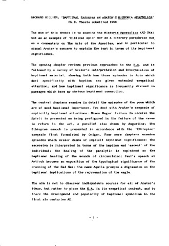 The aim of this thesis is to examine the Historla Apostolica (AD 544) not as an example of 'biblical epic' nor as a literary paraphrase but as a commentary on The Acts of the Apostles, and in particular to signal Arator's concern to explain the text in terms of its baptismal significance. The opening chapter reviews previous approaches to the H.A. and is followed by a survey of Arator's interpretation and interpolation of baptismal material, showing both how those episodes In Acts which deal specifically with baptism are given extended exegetical attention, and how baptismal significance is frequently divined in passages which have no obvious baptismal connection. The central chapters examine in detail the episodes of the poem which are of most baptismal importance. Two deal with Arator's exegesis of explicitly baptismal situations: Simon Magus' failure to receive the Spirit is presented as being prefigured in the failure of the raven to return to the ark, a parallel also drawn by Augustine; the Ethiopian eunuch is presented in accordance with the Ethiopian’ exegesis first formulated by Orlgen. Four more chapters examine episodes which Arator deems of implicit baptismal significance: the ascension is interpreted In terms of the baptism and ascent' of the individual; the healing of the paralytic Is explained as the baptismal healing of the wounds of circumcision; Paul's speech at Antloch becomes an exposition of the typological significance of the crossing of the Red Sea; the name Aquila prompts a digression on the baptismal Implications of the rejuvenation of the eagle. The aim is not to discover indisputable sources for all of Arator's ideas, but rather to place the H.A. in its exegetical context, and to trace the development and popularity of baptismal symbolism in the first six centuries AD.