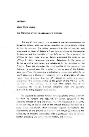 The aim of this thesis is to re-examine how Calvin understood the threefold office, with particular attention to the prophetic office, In his Christology. The author suggests that the offices are best understood In light of Calvin's fresh Interpretations of Chalcedonlan Christology and the Insights of the Reformation. The problem of the offices is their Interrelation. Calvin understood the unity of the offices in their relational character. Relational In the person of Christ as divine and human, and relational In the structure of the Trinity. These two elements, the relationality of the person of the Mediator, premised upon the relation of the persons of the Trinity, gave the offices the necessary ontological structure from which Calvin could postulate a theory of redemption with a single point of view, rather than previous theories of redemption which are simply juxtaposed. This unifying centre Is the person of the Mediator in the activity of the offices. It Is from this centre that Calvin interpreted the various biblical metaphors which are extremely difficult to bring together Into a unity. The argument Is carried further as the prophetic office In Calvin Is shown to contain the required ontological structure of the remaining offices of king and priest. Calvin's Insistence on the unity of the activity of God in each of the offices explains why there is a unity within the Church, which transcend temporal distinctions. The distinctions of the offices in history allows Calvin to underscore the centrality of Christ's incarnation into a particular time In history, further grounding the work of God In history and creation.