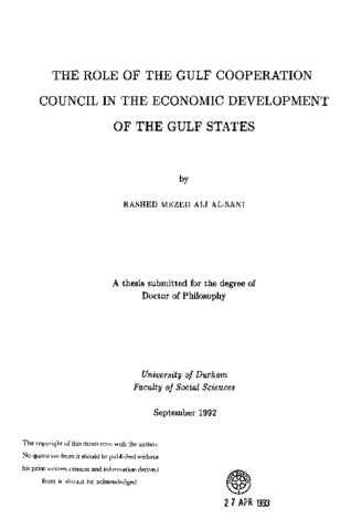 As a regional organisation, the Gulf Cooperation Council is a somewhat unique experiment in the contemporary Middle East and in the Arab world in particular. It is the first regional organisation in the modern Arab nation-state system, aside from the Arab League, formed in 1946, that has epoused a functional approach to cooperation, while at the same time preserving the political sovereignty and independence of the member states. Since its founding, the GCC has been the focus of debate regarding its nature and functions. Intentionally or not, it has become a major media event, a fact that has contributed to the credibility gap between rising expectations based on public pronouncements and real achievements. This thesis is an inquiry into the role of the Gulf Cooperation Council in the economic development of the participating countries. The study comprises seven chapters, detailing both the scope and purpose of the study, and the criteria employed in the research. The main chapters examine the relative contribution of physical and human resources involved in cooperation between the Gulf countries. In addition, the contribution of agriculture and fisheries, as well as industrial development, to the G.C.C. countries are expounded. The services in the G.C.C. countries are specified. External trade and migration in the G.C.C. countries is discussed in detail. The conclusion describes the role of the Gulf Cooperation Council in economic development and includes suggestions and recommendations for the future.