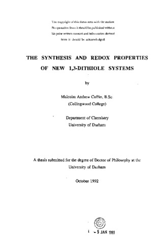 The theory of conductivity in organic metals and a review of organic π-electron donors is introduced in Chapter One, outlining some of die many variations that have been made to the tetrathiafulvalene (TTF) molecule, the donor component in the first true organic metal. A range of new' alkylseleno-substituted ethanediylidene-2,2’-bis(l,3-dithiole) donors have been efficiently synthesised. These compounds form semi-conducting charge- transfer complexes with 7,7,8,8-tetracyano-p-quinodimethane (TCNQ). The synthesis, electrochemistry. X-ray crystal structure and magnetic properties are presented (Chapter Two). Various 1,3-dithiolium cations and 1,3-dithiole anions have been used in the synthesis of compounds targeted as high-spin systems (Chapter Three). The theory of organic ferromagnetism is discussed, and various compounds with interesting magnetic and redox properties have been prepared. Chapter Four deals with the synthesis of a series of conjugated, multi-1,3-dithiole, multi-chalcogen, π-electron donors. These compounds are members of the dendralene family of hydrocarbons and the crystal structure of a tricyclic [3]-dendralene is presented. The formation of semi-conducting charge-transfer salts is also discussed. Multistage redox behaviour of a new anthraquinodimethane derivative of TTF has been observed (Chapter Five), and cyclic voltammetic data and X-ray crystal structures of such systems are presented.