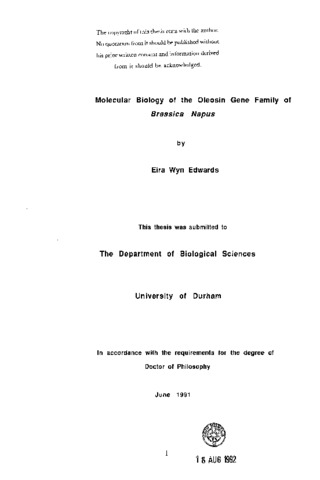 Oilseed rape (Brassica napus) is a valuable oil producing crop plant. Oil is produced by developing seeds and constitutes 45% of the dry seed weight. Storage oil is deposited as triacylglycerol in spherical structures called oil bodies. These are coated by a phospholipid monolayer interspersed with proteins called oleosins, which serve as emulsifiers, retaining the integrity of individual oil bodies. In this project the oleosin gene family of B. napus was studied. Sequence information was obtained on two oleosin cDNA clones and a genomic clone was also isolated. The sequences for oleosins from B. napus were compared with those isolated from other plant species. Preliminary expression studies were carried out, relating the timing of oleosin mRNA and protein production to the stages of embryo development. These results give an indication of the importance of transcriptional and post-transcriptional processes in the control of oleosin expression.